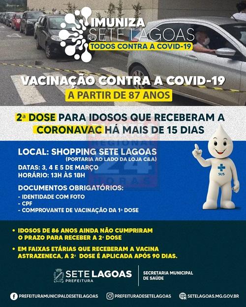 Os idosos a partir dos 80 anos de idade começarão a ser vacinados contra a Covid-19, em Sete Lagoas, a partir desta quarta-feira (3), com imunização deste público indo até o dia 5, sexta-feira, de 8h30 às 17h.