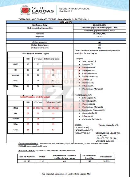 Boletim Epidemiológico da Prefeitura de Sete lagoas informa que foram registrados 83 novos casos positivos da Covid-19 nas últimas 24h, sendo 43 mulheres e 40 homens, o que eleva o número de contaminados a 11.167 desde o início da pandemia. Dois óbitos em decorrência de complicações da Covid foram registrados.