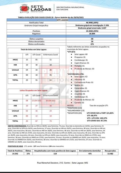 Dia 26 – mulher de 73 anos (Hospital Municipal); dia 22 – mulher, 51 anos (em domicílio); dia 26 - mulher de 57 anos, na UPA; dia 26 – mulher de 80 anos (Hospital Municipal); dia 28 – homem de 68 anos (Hospital Municipal); dia 28 – mulher de 48 anos (Hospital Municipal); dia 28 – mulher de 64 anos (Hospital Municipal); dia 27 – homem de 63 anos (Hospital Municipal); dia 26 – homem de 85 anos, na UPA; dia 26 – homem de 64 anos, UPA; dia 26 – homem de 53 anos, UPA; dia 27 – mulher de 38 anos (Hospital Nossa Senhora das Graças); dia 27 – mulher de 76 anos (Hospital Nossa Senhora das Graças); dia 26 – homem de 75 anos (Unimed); dia 26 – mulher de 80 anos (Unimed); dia 27 – mulher de 67 anos (Unimed); e dia 28 – homem de 69 anos (Unimed). Assim, Sete Lagoas chega hoje 275 mortes desde o início da pandemia.